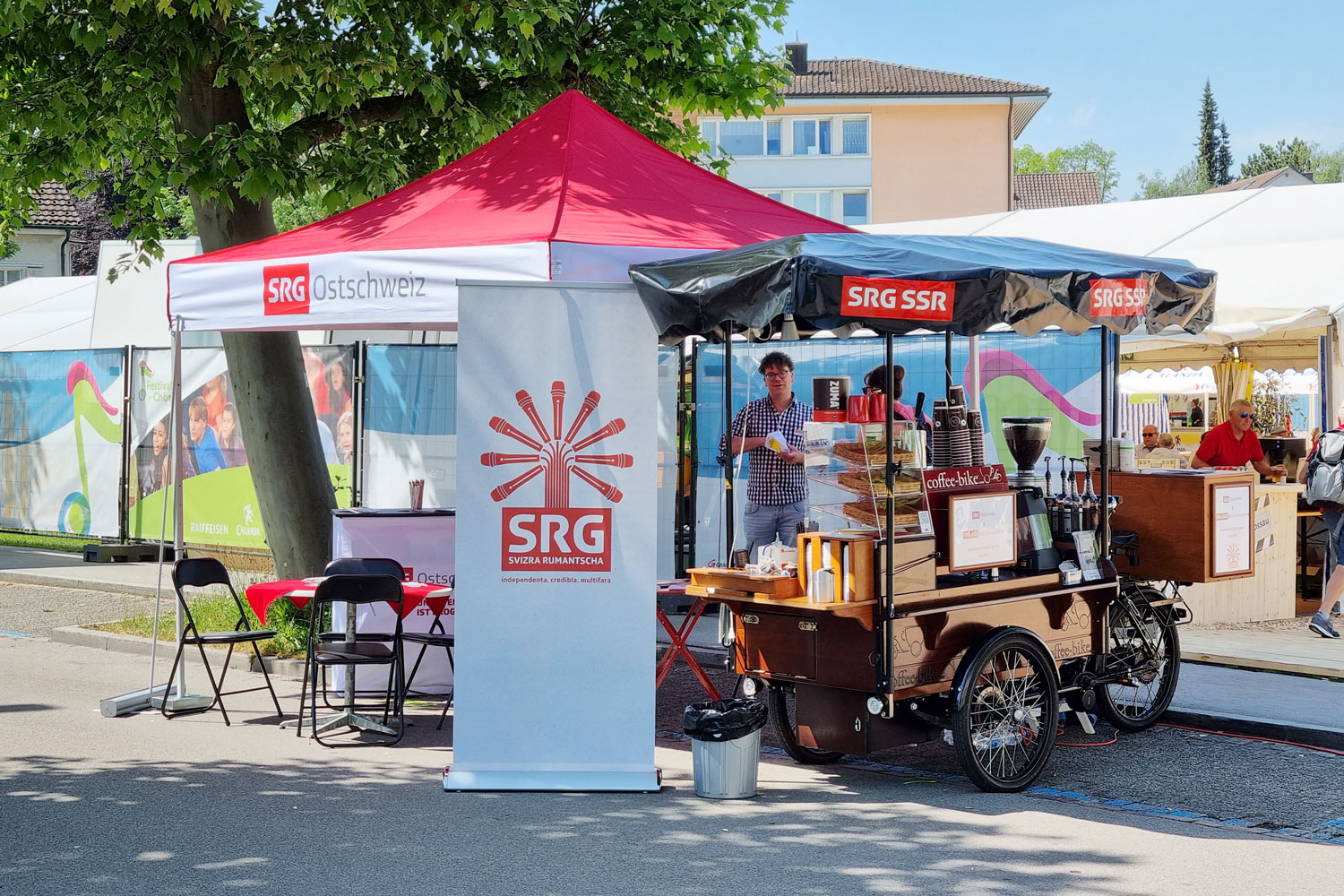 Es war nicht nur ein Blickfang, sondern diente auch als Eisbrecher für interessante und zum Teil tiefgründige Gespräche mit Festivalbesucher:innen: das Café-Bike auf drei Rändern. Dieses betrieb die SRG SSR Svizra Rumantscha (SRG.R) zusammen mit der SRG Ostschweiz Ende Mai 2022 am Festival der Chöre in Gossau. Rund 5000 Kaffeebecher gingen innert fünf Tagen über die Theke. Das Festival war für die SRG.R auch der Auftakt, um das im Frühling verabschiedete Wirkungsmodell anzuwenden. Dabei geht es darum zu messen, welche Wirkung die Aktivitäten und Veranstaltungen der SRG.R haben. Relevant ist nicht mehr, dass ein Anlass stattfindet, sondern vielmehr, was die SRG.R damit erreicht. Das Ziel soll sein, Verständnis für die SRG in der Bevölkerung zu schaffen. Das ist auch eine der wichtigsten Säulen der neuen Trägerschaftsstrategie der SRG. Die SRG.R ist überzeugt, dass der gelungene Festivalauftritt in Gossau auf dieses Ziel eingezahlt hat.