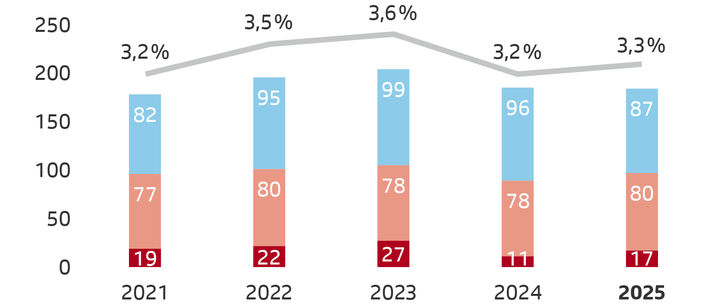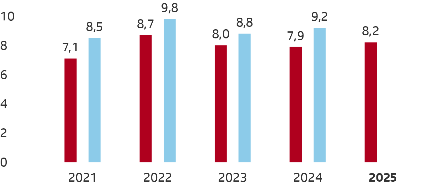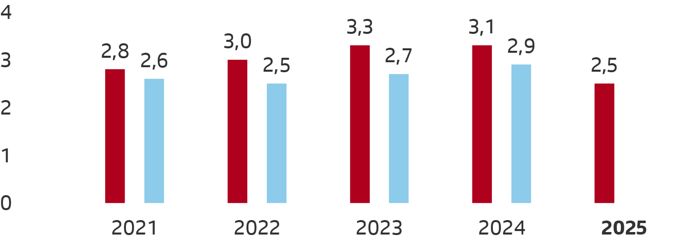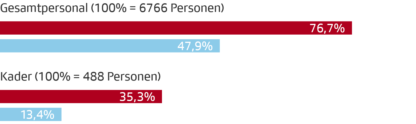 | ** | Datenvergleich verschiedener privatwirtschaftlicher Grossunternehmen sowie bundesnaher Betriebe der Schweiz, Durchschnittswert der Jahre 2020–2024 |