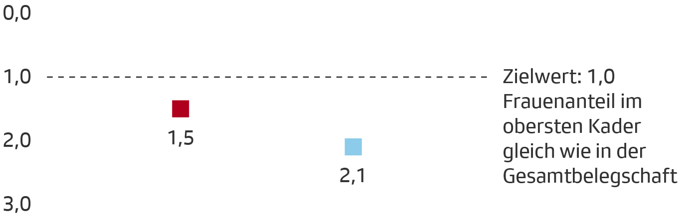 Der «Glass Ceiling Index» (GCI) beschreibt die «gläserne Decke», die Frauen das Aufsteigen in die oberste Führungsetage erschwert. Der Index vergleicht den Frauenanteil auf einer bestimmten Kaderstufe (SRG: Geschäftsleitung der SRG und der Unternehmenseinheiten) mit dem Frauenanteil in der gesamten Belegschaft. Der GCI errechnet sich wie folgt: Frauenanteil Gesamtbelegschaft ÷ Frauenanteil oberstes Kader. Ein GCI von 1 ist optimal und bedeutet, dass Frauen in der analysierten Kaderstufe anteilsmässig gleich vertreten sind wie in der Gesamtbelegschaft. Der GCI der SRG beträgt 1,5 (Frauenanteil Gesamtbelegschaft von 42 Prozent ÷ Frauenanteil oberstes Kader von 29 Prozent). Im Vergleich zum Vorjahr (1,4) ist der GCI 2025 leicht gestiegen. Die SRG ist bestrebt, den GCI weiter zu verbessern. Im Vergleich zum Schweizer Benchmark*, der bei 2,1 liegt, schneidet die SRG gut ab.