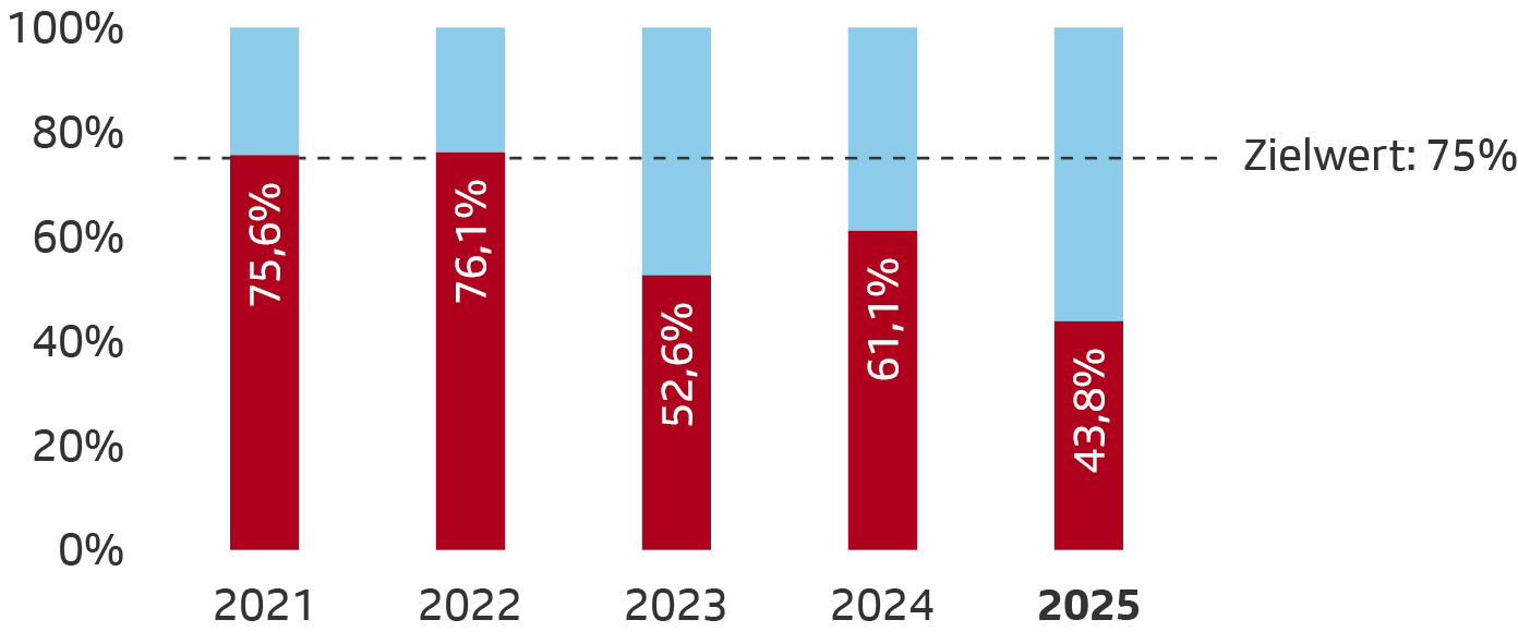 Dieser Indikator misst den Anteil an neuen Kadern, die intern rekrutiert wurden. Ein hoher Wert ist ein Indiz für attraktive Entwicklungsperspektiven. In den Jahren 2021 und 2022 bewegte sich die SRG stabil um ihren Zielwert von 75 Prozent. Seit 2023 liegen die Werte tiefer – vor allem deshalb, weil zahlreiche Fachspezialist:innen extern rekrutiert werden mussten.
