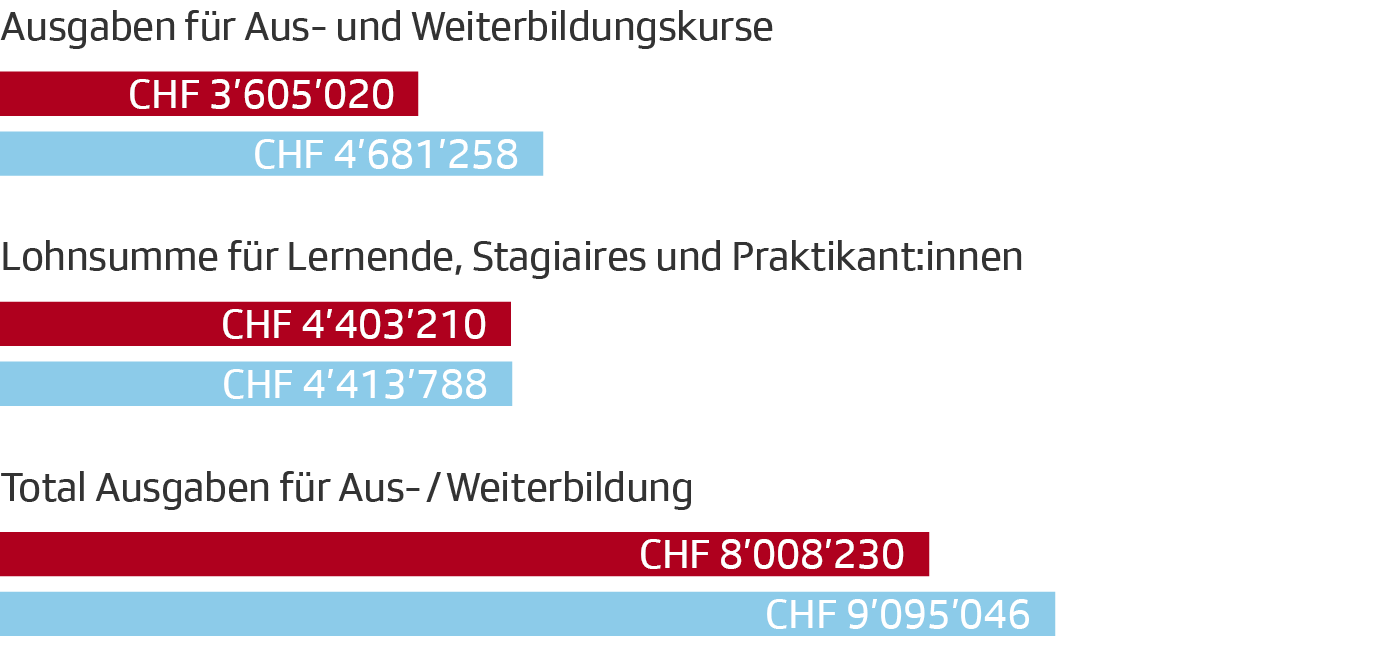 Die SRG investierte in den letzten 5 Jahren jährlich rund 9 Millionen Franken oder 1,4 Prozent der Gesamtlohnsumme in die interne und externe Aus- und Weiterbildung ihrer Mitarbeiter:innen. Der Betrag umfasst die Ausgaben für Kurse beziehungsweise Referent:innen und die Lohnkosten für Lernende, journalistische Stagiaires und Praktikant:innen.