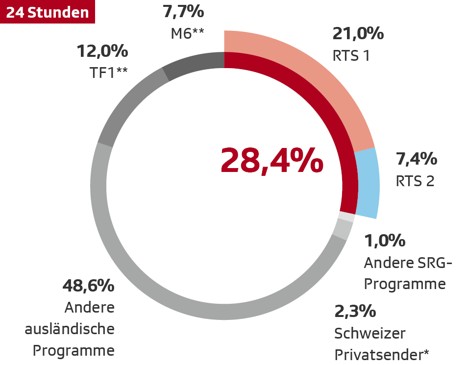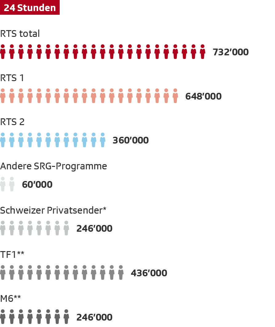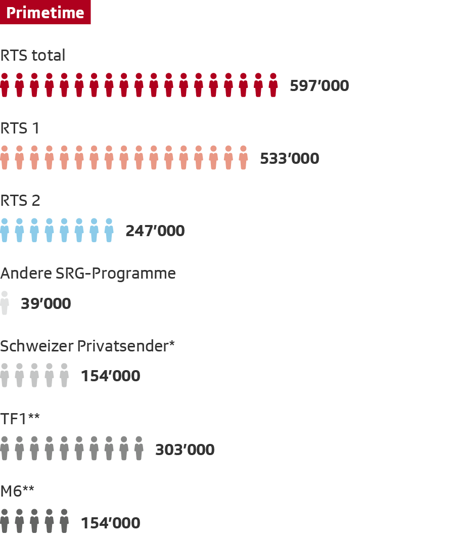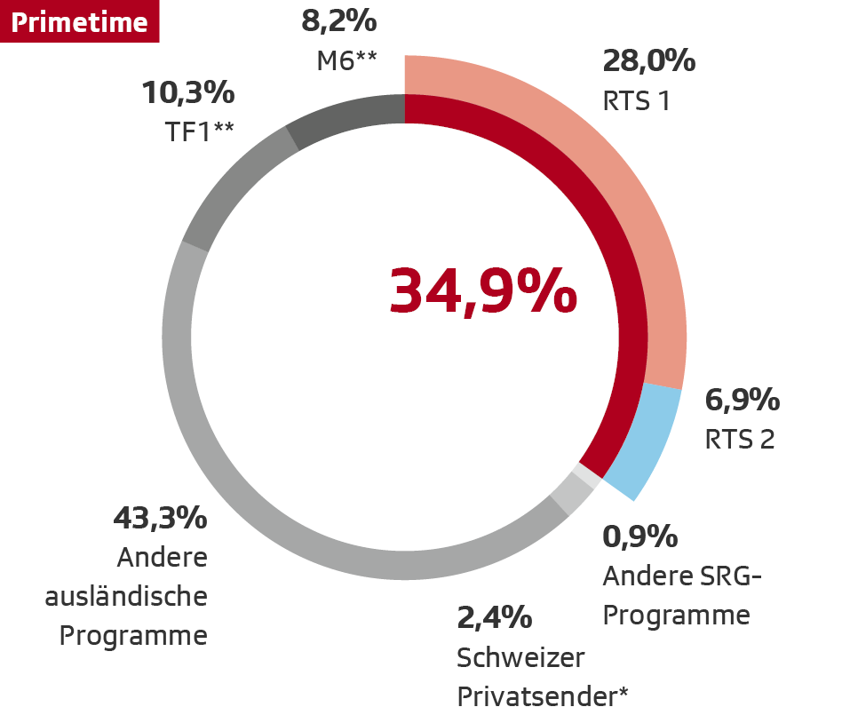 ** Bei diesen Sendern handelt es sich um die stärksten ausländischen Konkurrenten von RTS. Für die Sender TF1 und M6 wurde nur das Schweizer Signal einbezogen.
