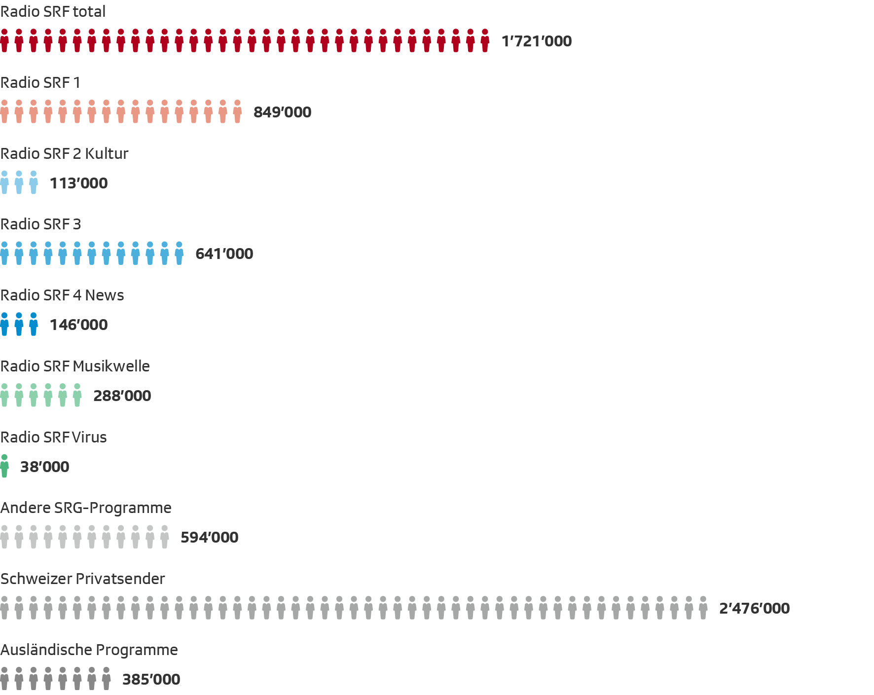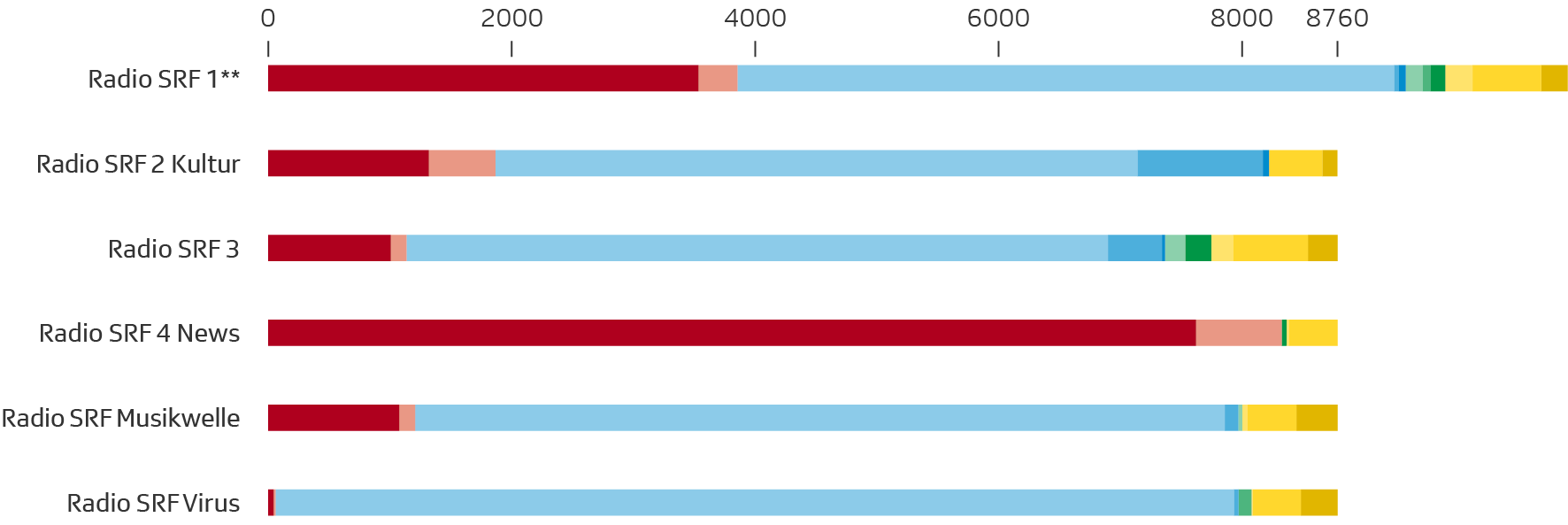 ** Bei Radio SRF 1 liegt das Stundentotal aufgrund der simultan laufenden Regionaljournale über dem Jahreswert von 8760 Stunden.