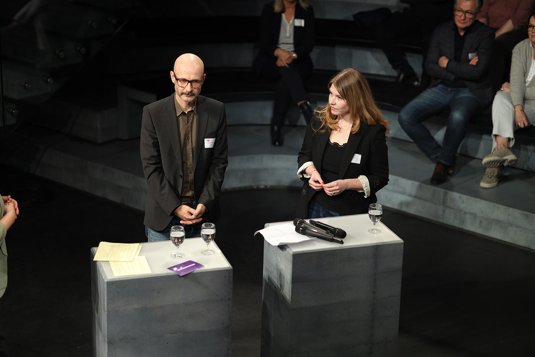 Jahresabschluss 2025 im «Arena»-Studio von SRF, bei dem Teilnehmer:innen aus dem Resonanzraum, Mitglieder des Leitungsteams und SRF-Programmschaffende zusammenkamen. Auf dem Bild: Christof Thurnherr und Eveline Hipeli (Bild: SRG.D / Pascal Zeder).
