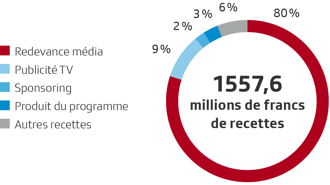 Près de 80 % (1252,8 millions de francs) des recettes de la SSR proviennent de la redevance média, tandis que 14 % (210,9 millions de francs) du budget sont financés par des recettes commerciales: 9 % (137,8 millions de francs) par la publicité télévisée, 2 % (29,3 millions de francs) par le sponsoring et 3 % (43,8 millions de francs) par le produit du programme. Le produit du programme se décompose en vente de droits, de licences et d’archives, en services téléphoniques payants à valeur ajoutée ainsi qu’en recettes générées par des coproductions. Les 6 % restants (93,8 millions de francs) correspondent principalement aux subventions fédérales pour SWI swissinfo.ch et tvsvizzera.it et pour la collaboration avec 3sat et TV5 Monde, au produit de la location d’immeubles ainsi qu'aux revenus liés à la vente des cartes Sat Access et à l’Eurovision.