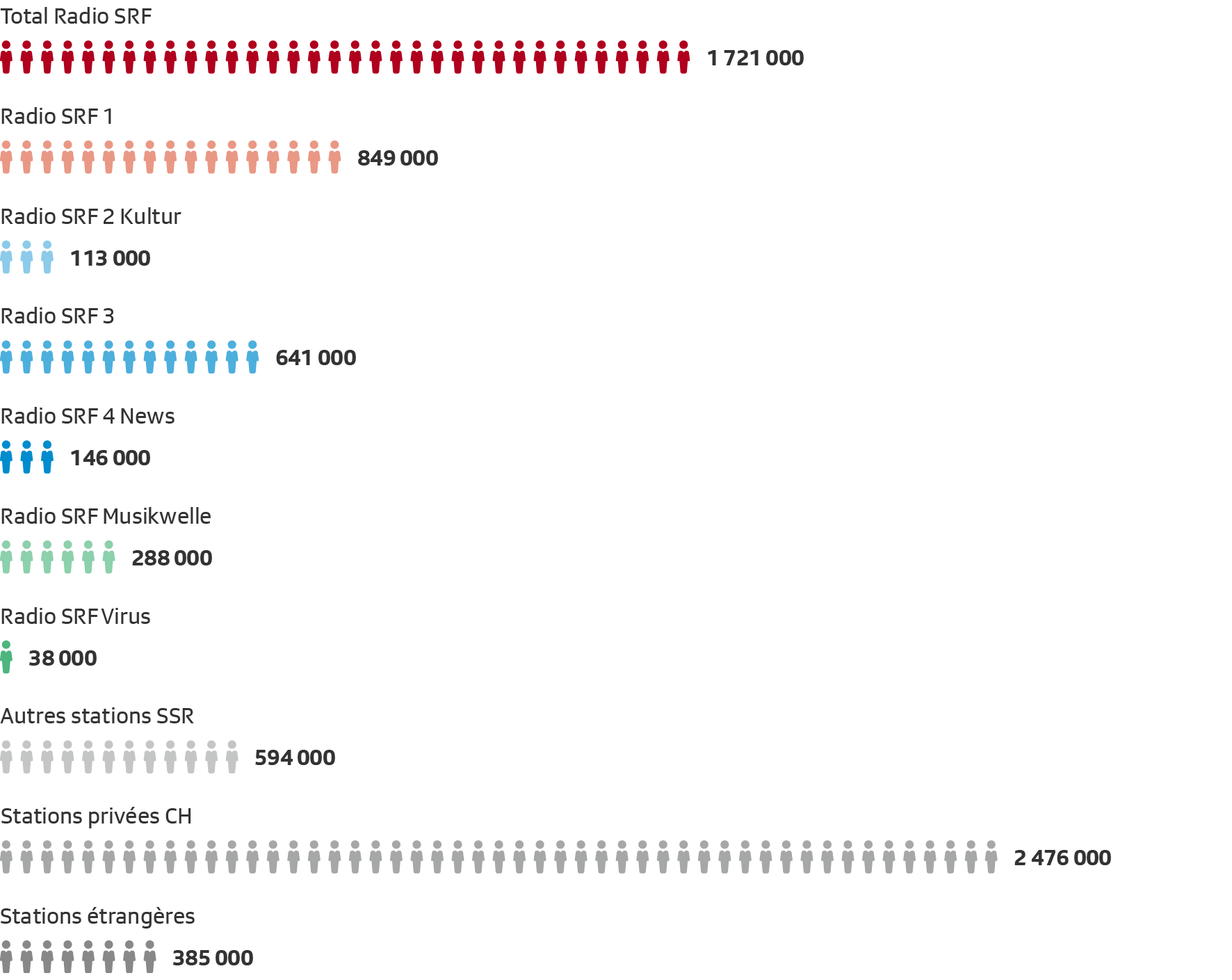 ** Sur Radio SRF 1, le total effectif dépasse 8760 heures par an en raison de la diffusion en parallèle des journaux régionaux.