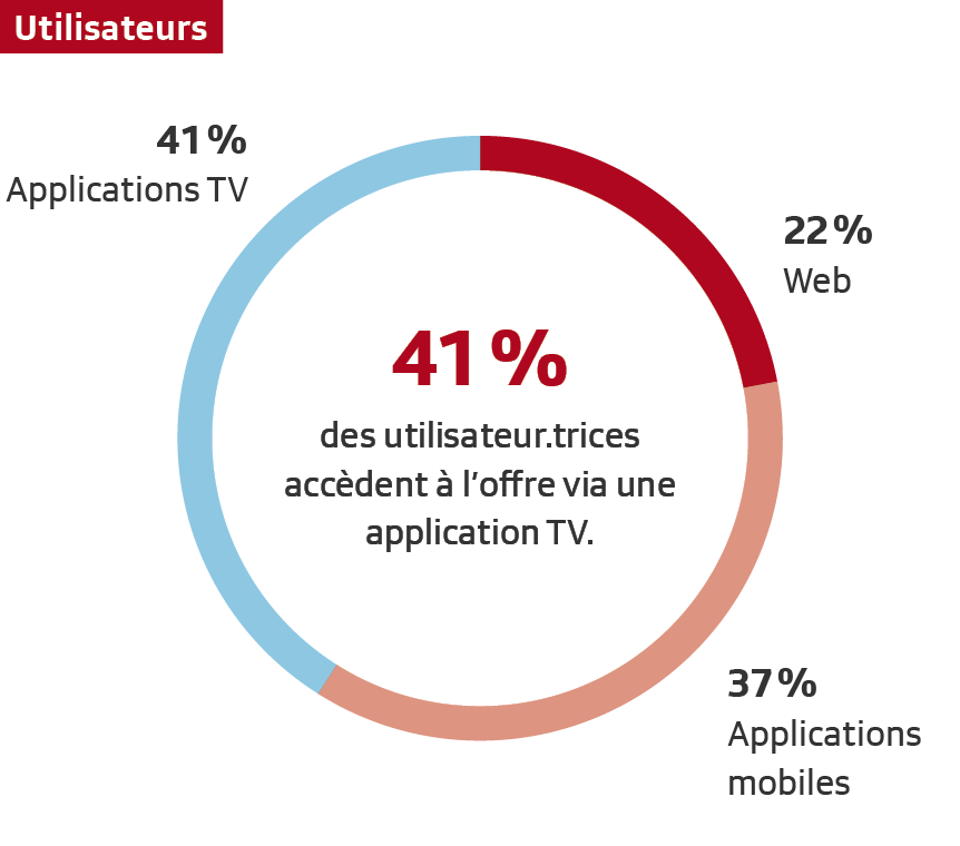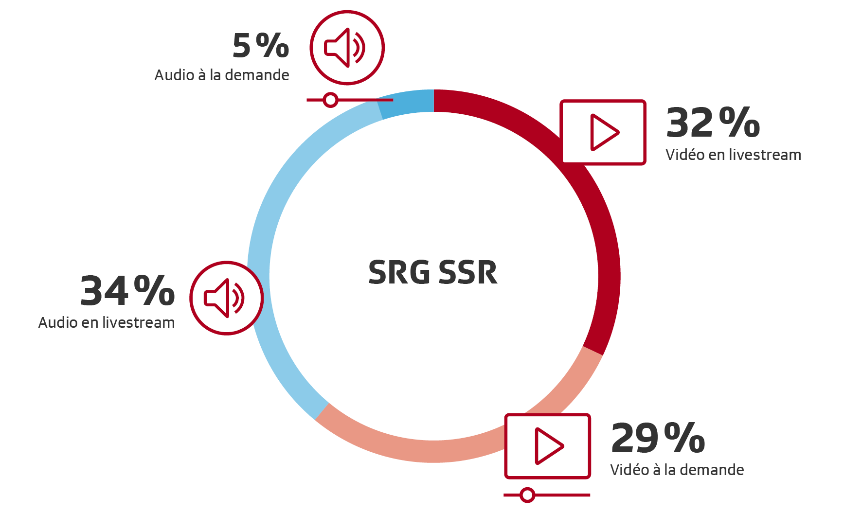 Explication: le graphique montre que les vidéos en livestream et à la demande et les audios en livestream (95 % au total) sont les plus utilisés, au détriment des audios à la demande (5 %).