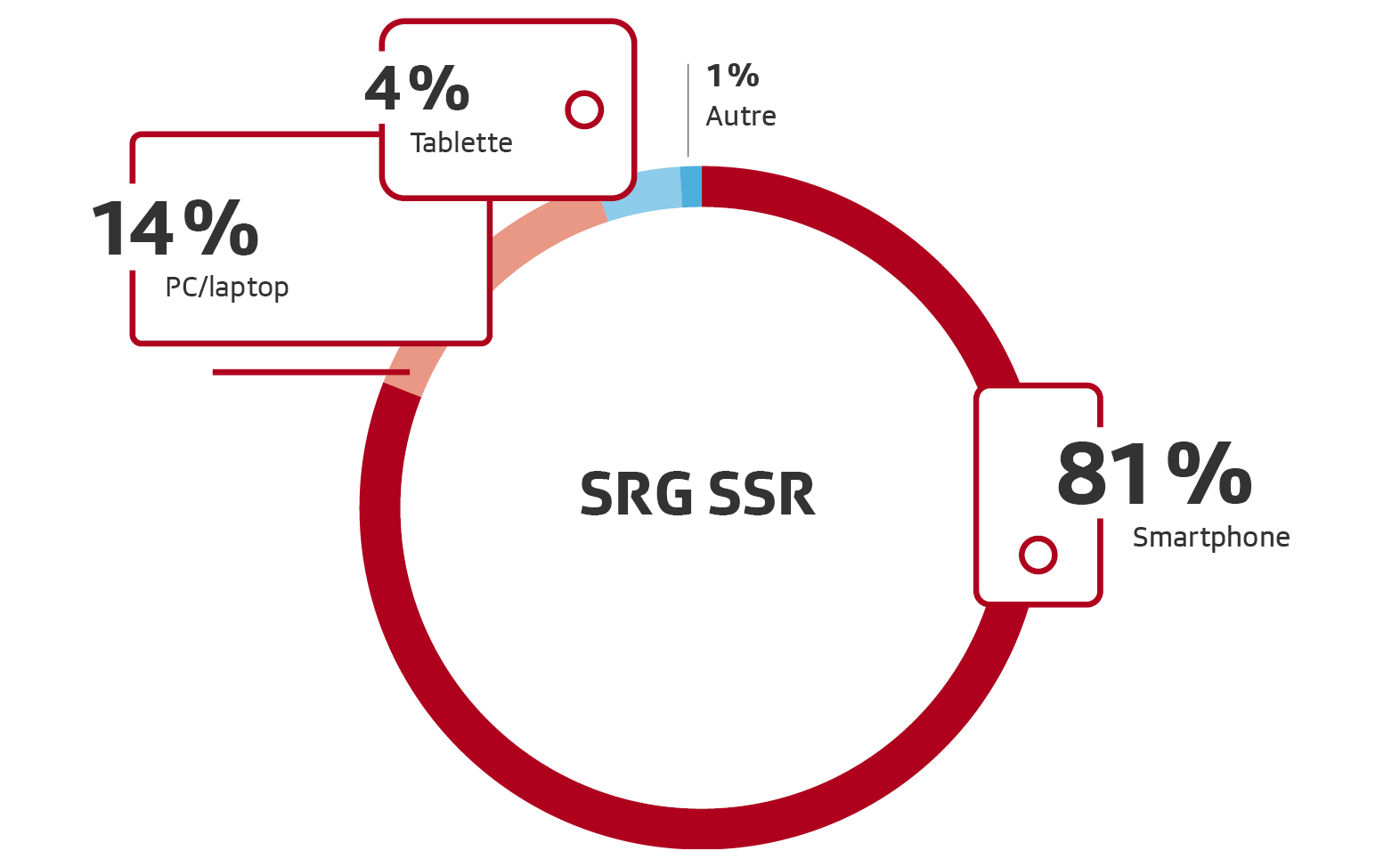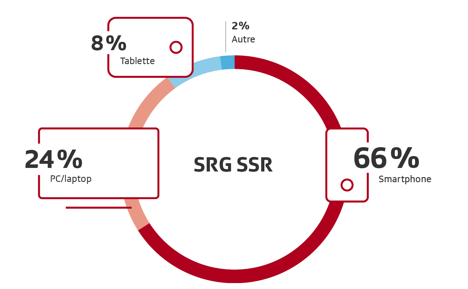 Explication: les deux graphiques soulignent que le choix de l’appareil est lié au type d’utilisation. Regarder ou écouter des contenus vidéo ou audio en streaming se fait généralement sur de plus grands écrans (PC/laptop: 24 % vs. 14 %) ou tablette (8 % vs. 4 %), tandis que lire des articles, par exemple, se fait plutôt sur smartphone (81 % vs. 66 %).