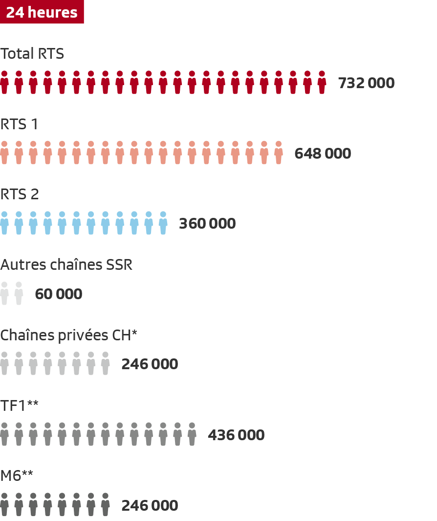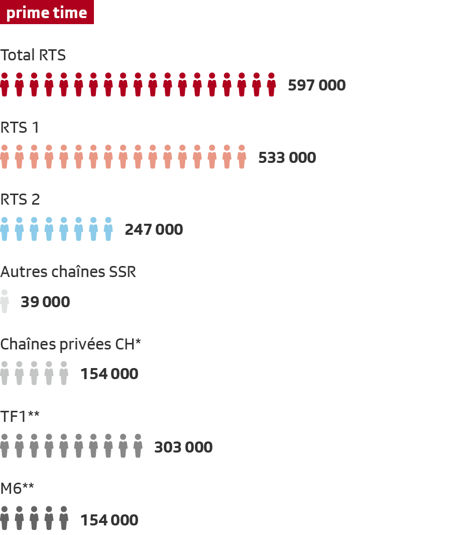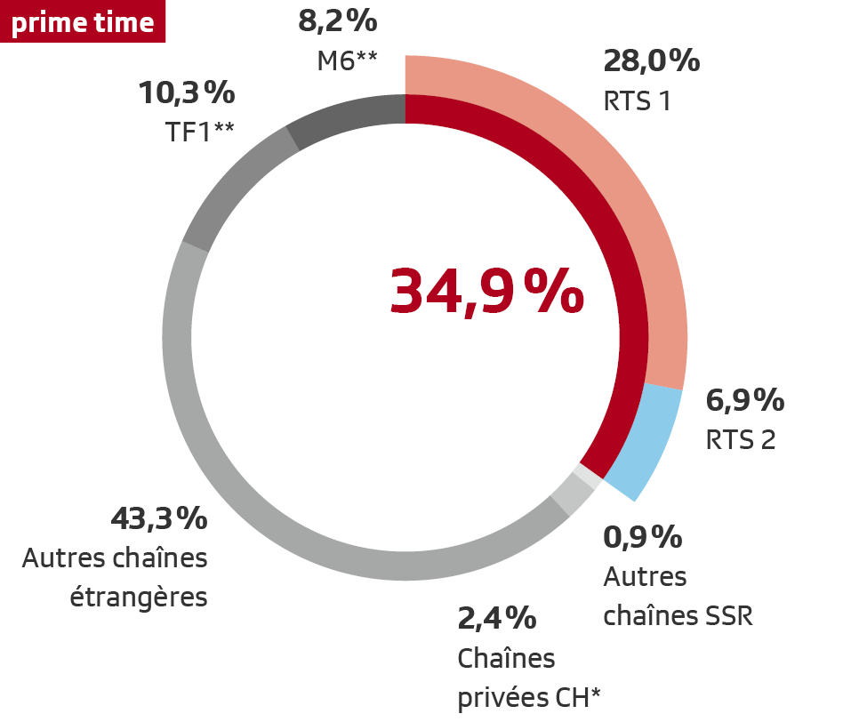 ** Ces chaînes sont les plus grandes concurrentes étrangères de la RTS. TF1 et M6: les données concernent uniquement le signal suisse.